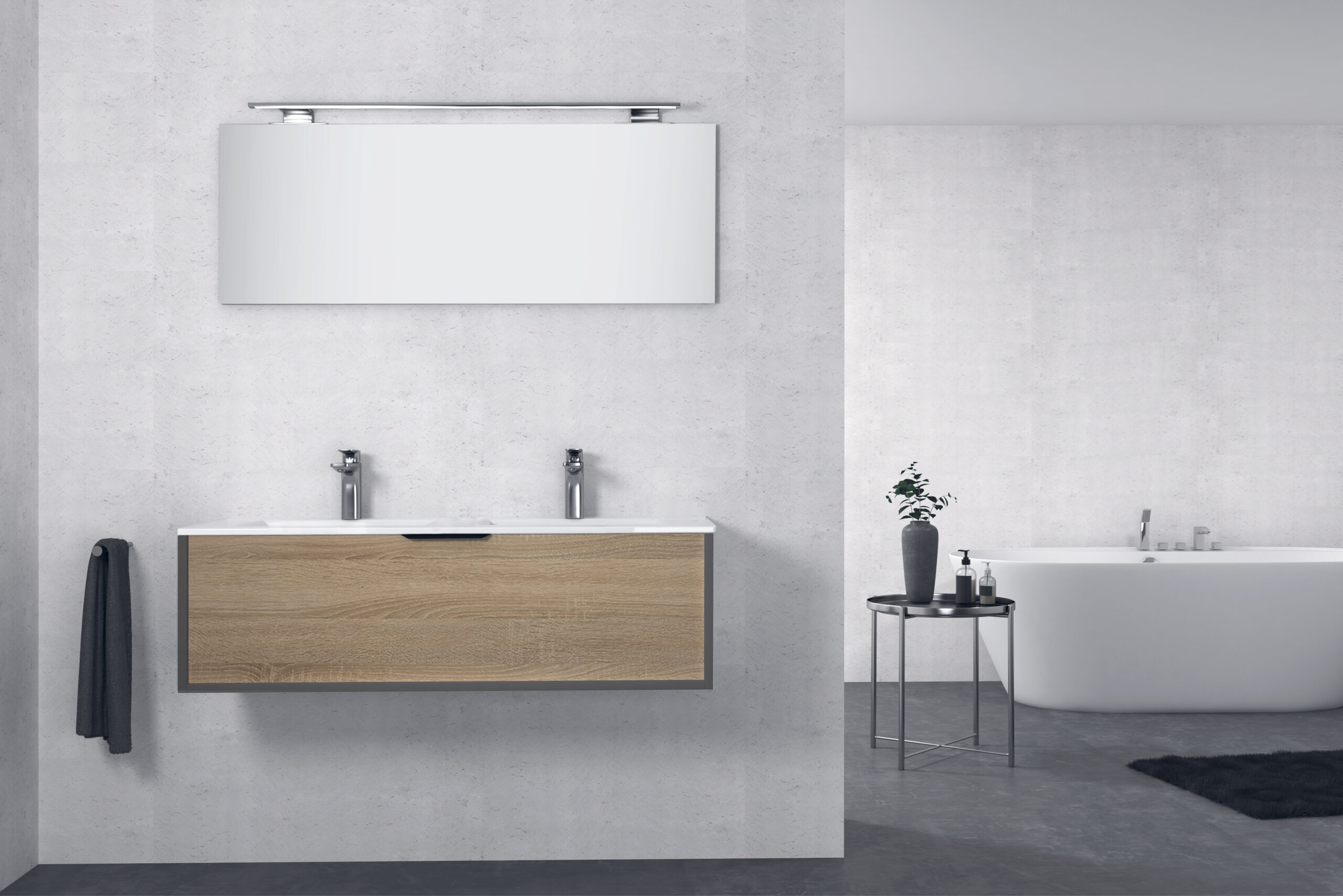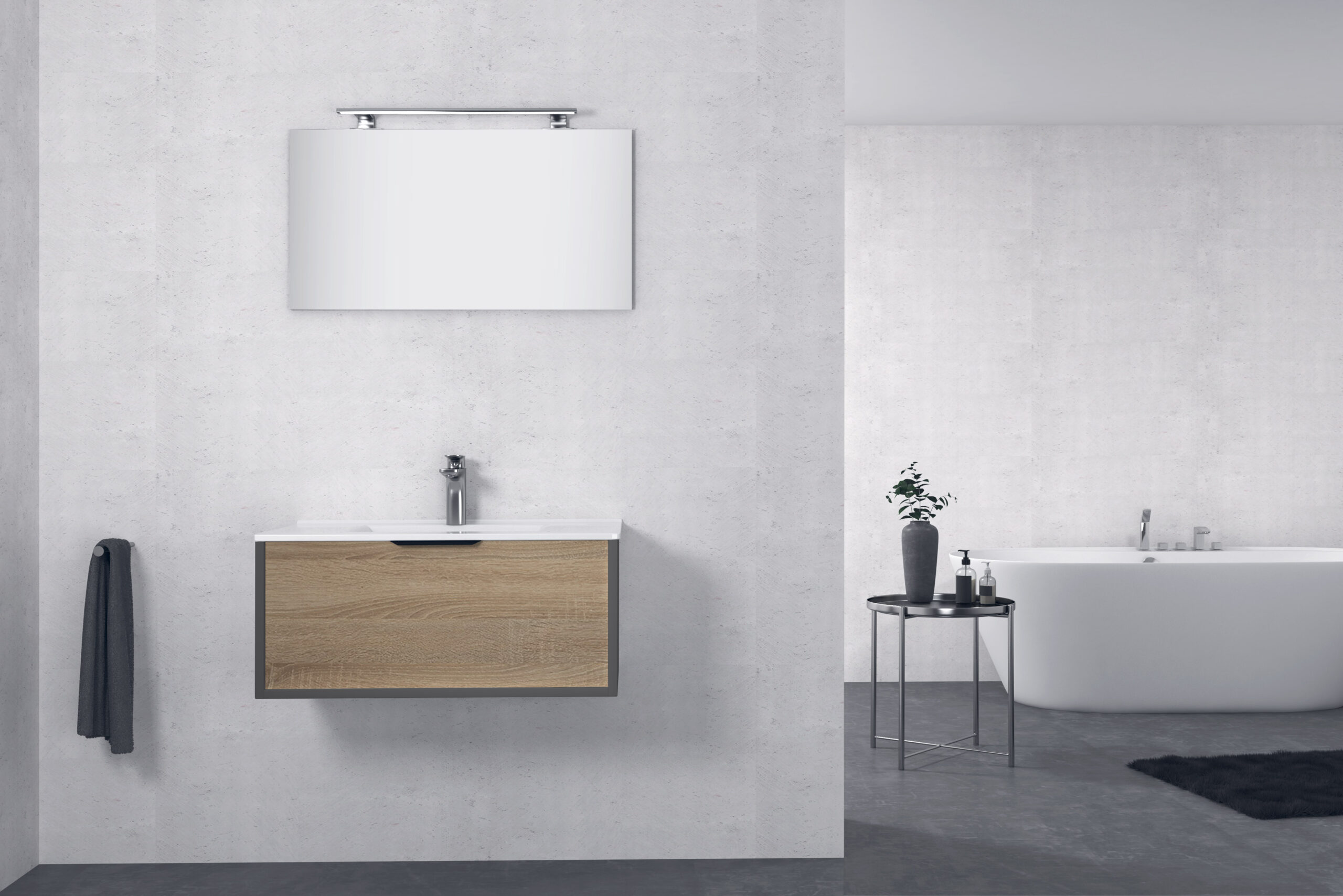 Meuble vasque de salle de bain en panneau stratifié avec tiroir à extension complète et système de fermeture amortie. Comprend une vasque en surface solide, un miroir et un éclairage LED. Fabriqué en Europe.