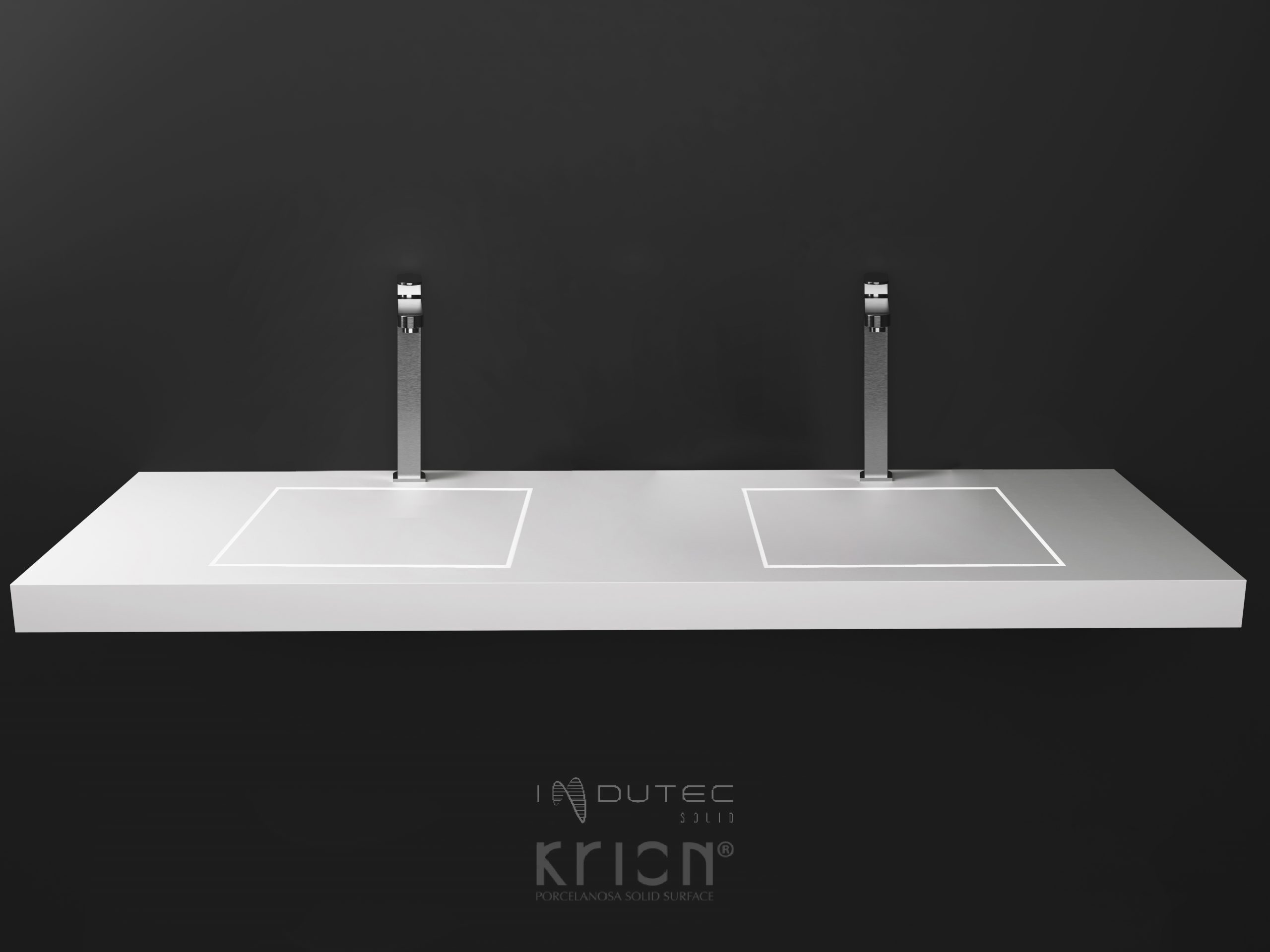 Vasque Solid Surface Plate avec éclairage LED sous vasque. Tablier de 7 cm et double vasque. Supports muraux inclus. Comprend un trou pour la robinetterie. Robinet non inclus.