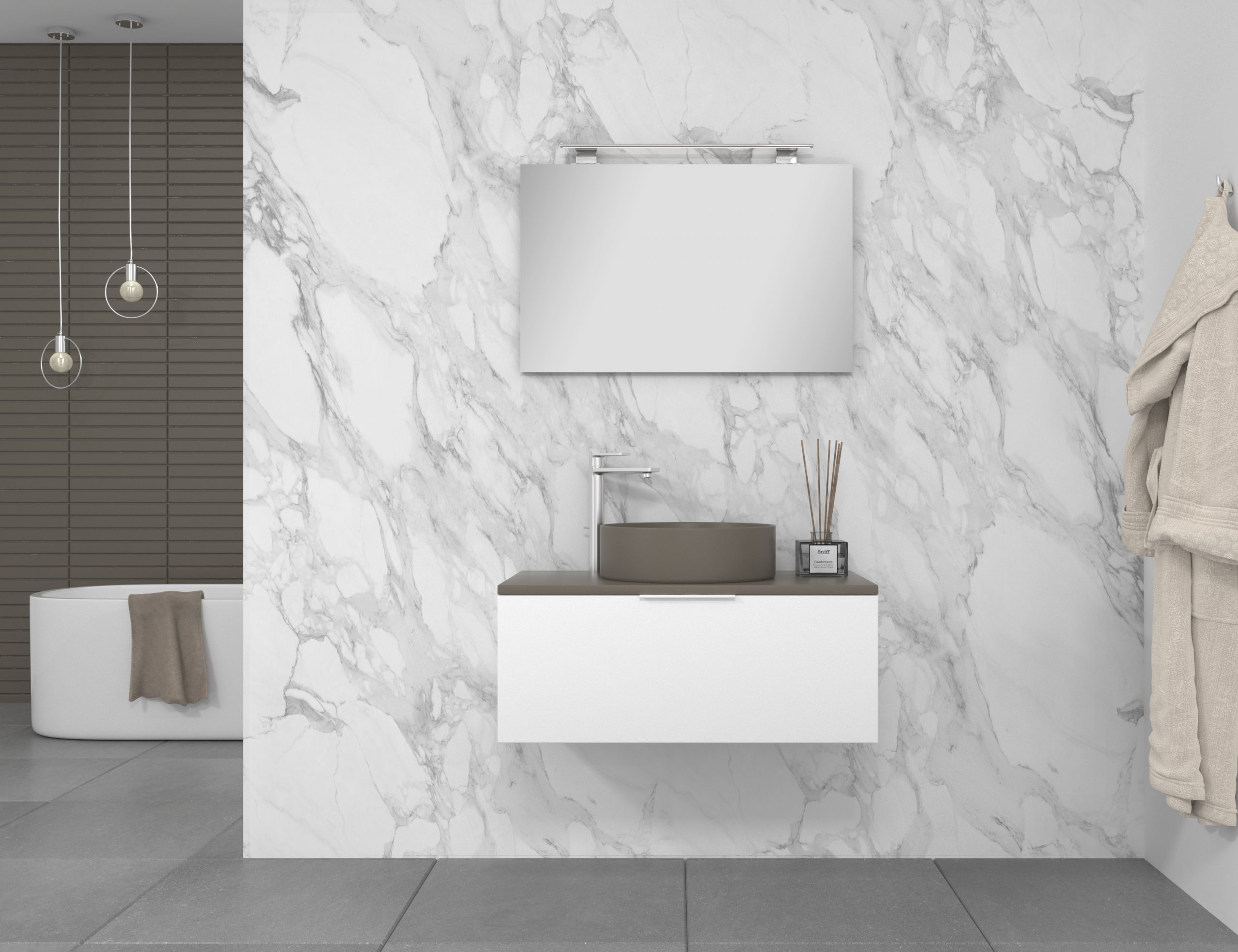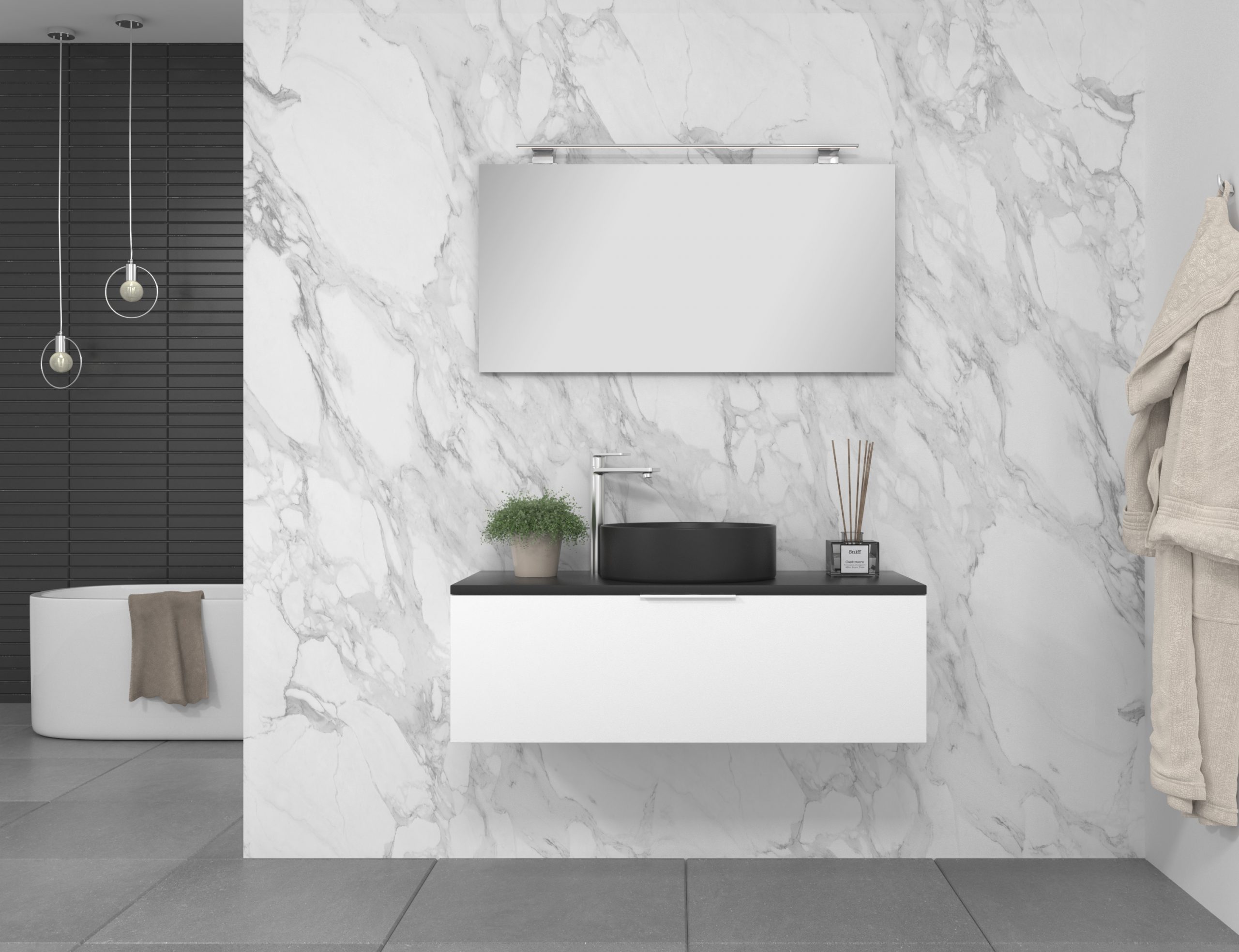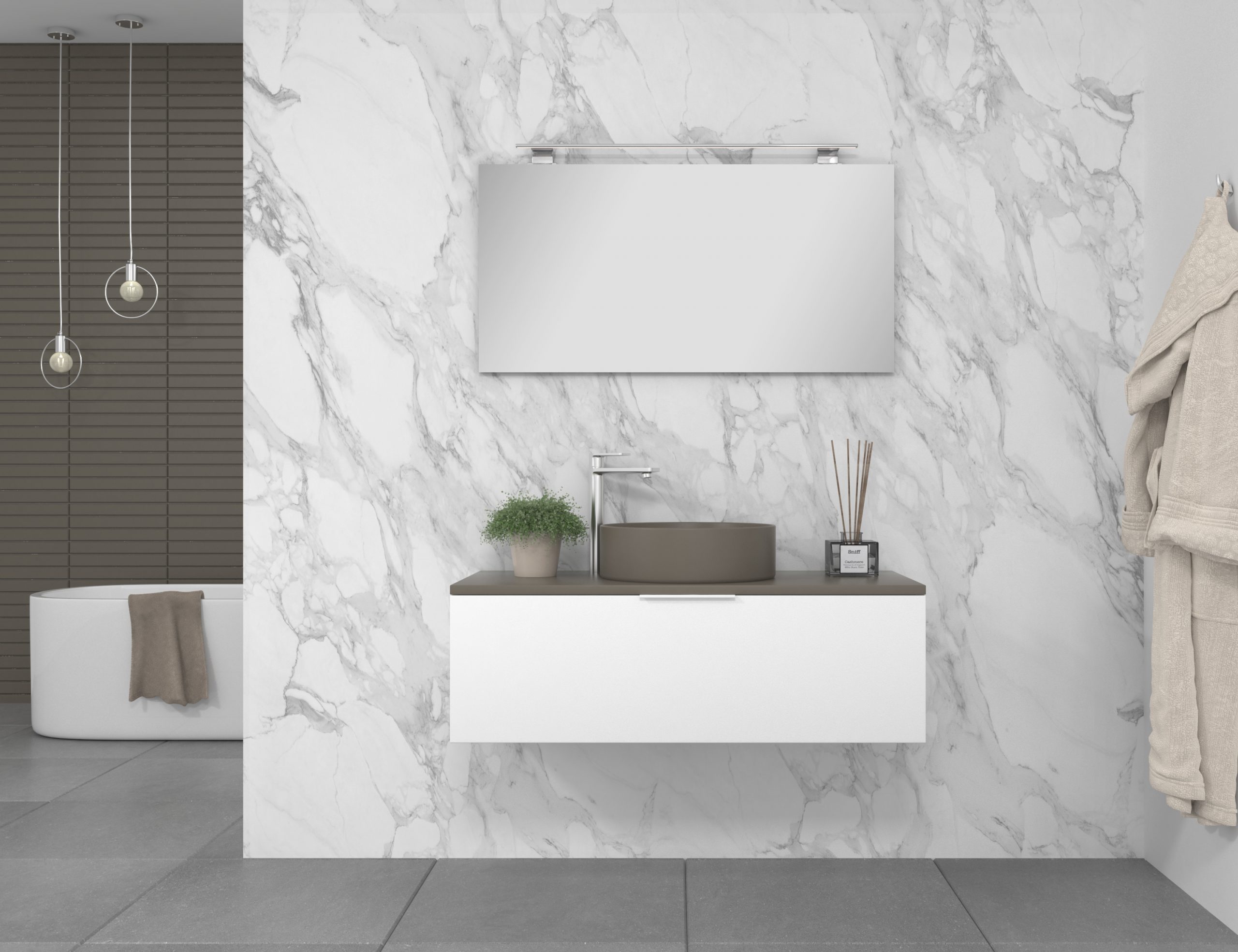 Pack composé d’un meuble de salle de bain fabriqué en panneau de particules mélaminé de 19mm stratifié blanc mat, comprenant un tiroir de grande capacité, entièrement extractible et à fermeture douce. Plan de travail du meuble de couleur assortie à la vasque à poser en céramique incluse. Miroir avec éclairage LED intégré inclus IP54, 6000ºK, 8,5W, 920 lumens. Fabriqué en Espagne.