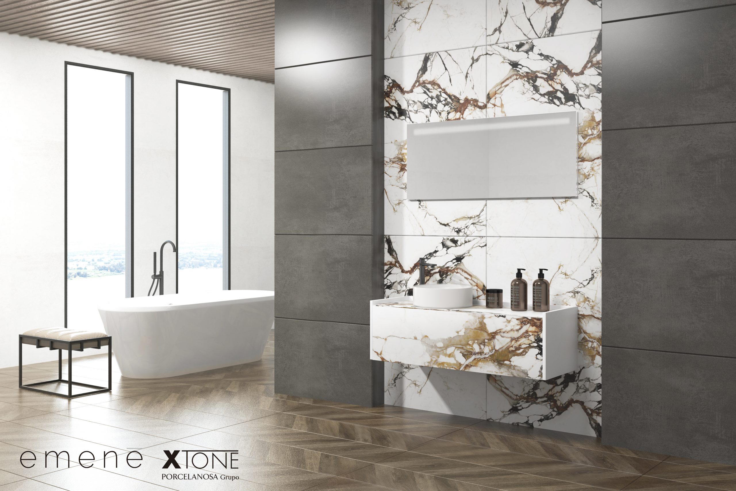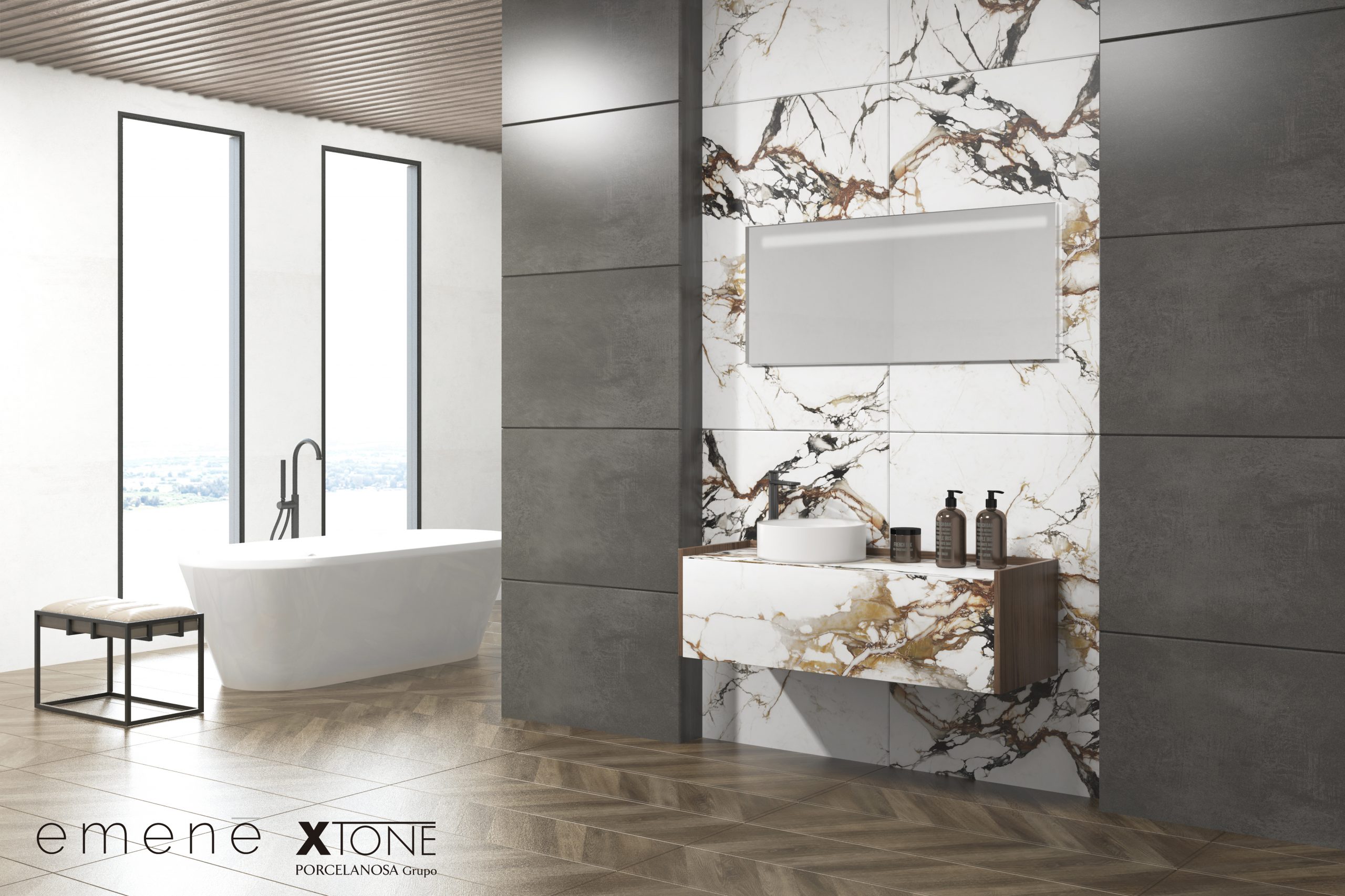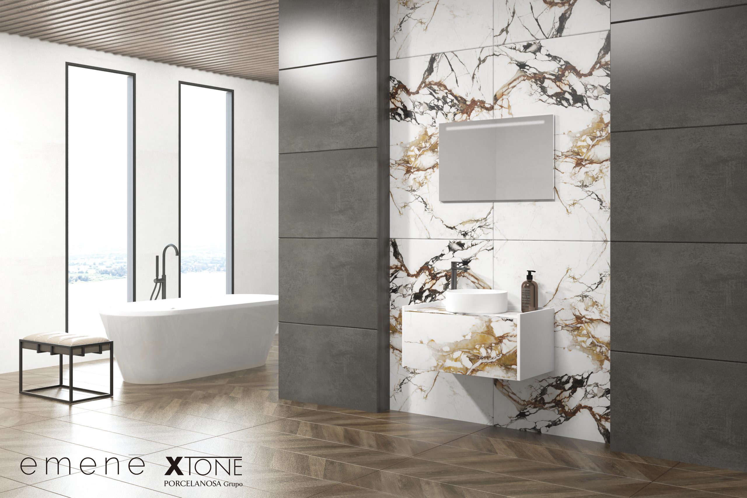 Pack de meuble de salle de bain suspendu, lavabo et miroir avec éclairage LED. Plan de toilette et façade fabriqués en matériau Xtone de Porcelanosa, un minéral compact fritté à partir d’une sélection de matières premières de la plus haute pureté, permettant d’obtenir une surface aux performances élevées. Meuble de salle de bain suspendu fabriqué en panneau de particules mélaminé finition bois de 19 mm avec micro-relief, doté d’un tiroir à extraction totale et fermeture douce, avec façade décorative en matériau céramique. Comprend un lavabo à poser en céramique. Comprend un miroir avec éclairage LED, IP65, 10,8 W, 1170lm et température de lumière 6000K. Le meuble est livré monté, prêt à être fixé au mur. Un kit de fixation pour le meuble est inclus. Robinet et siphon non inclus. Fabriqué en Espagne.