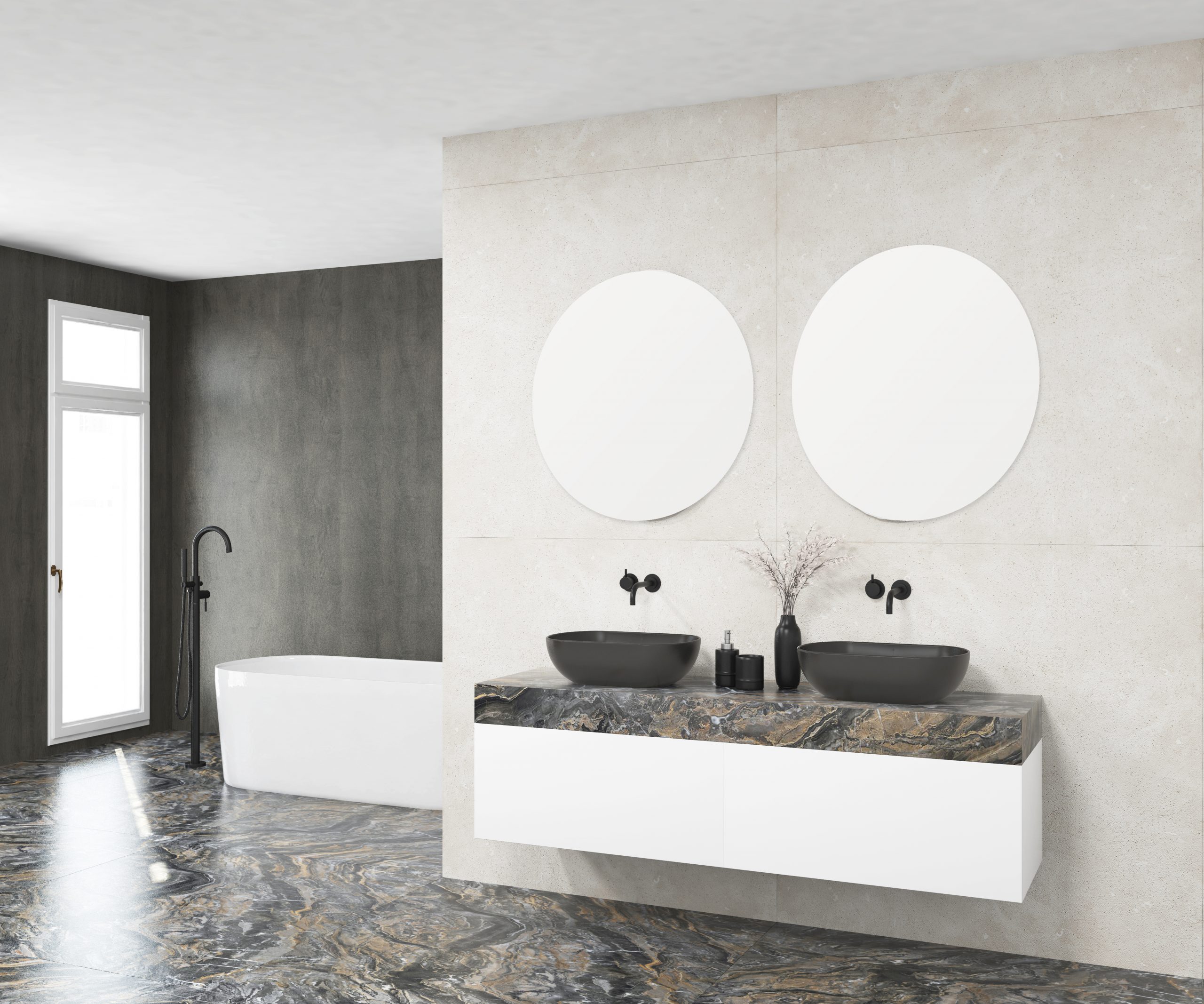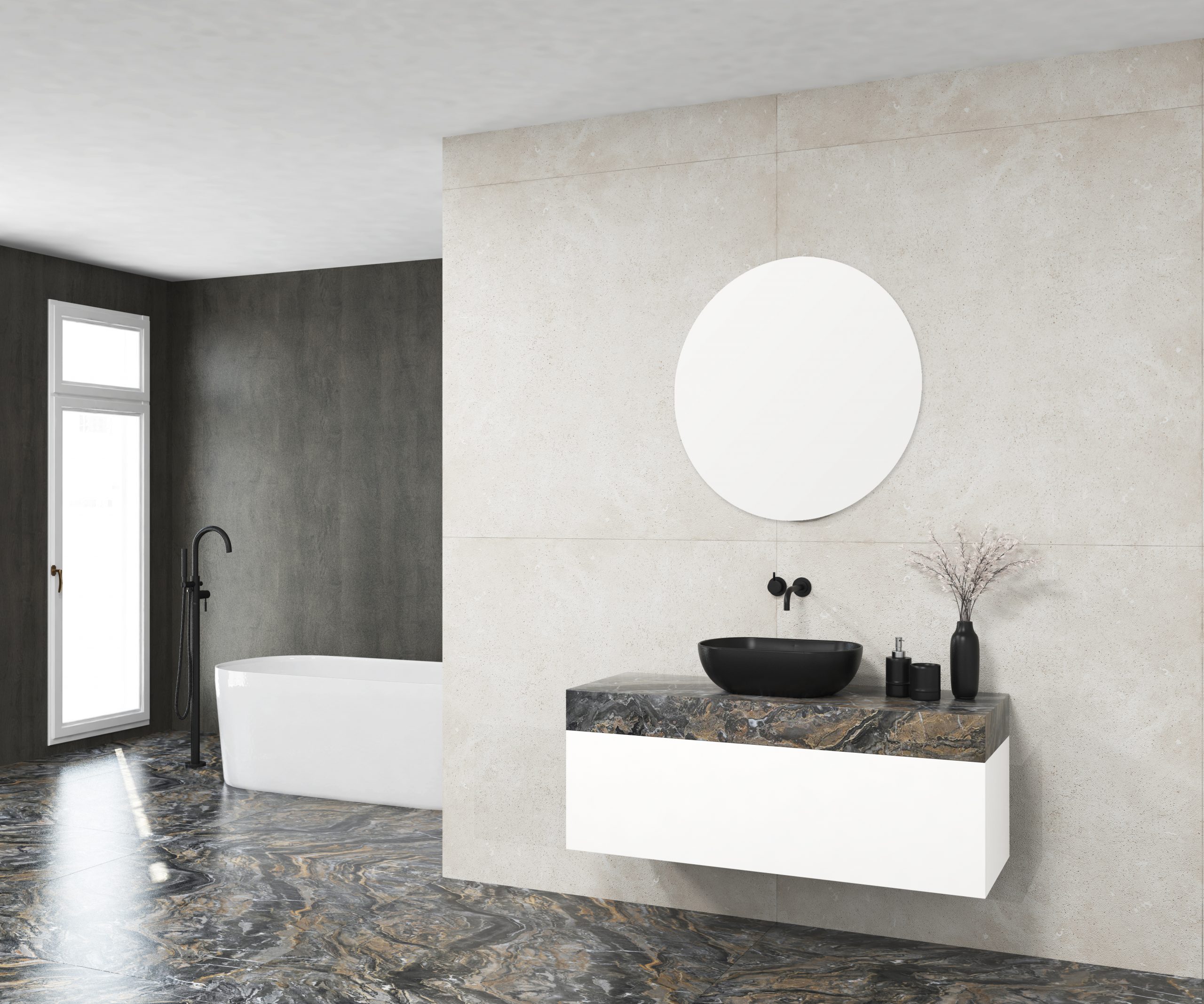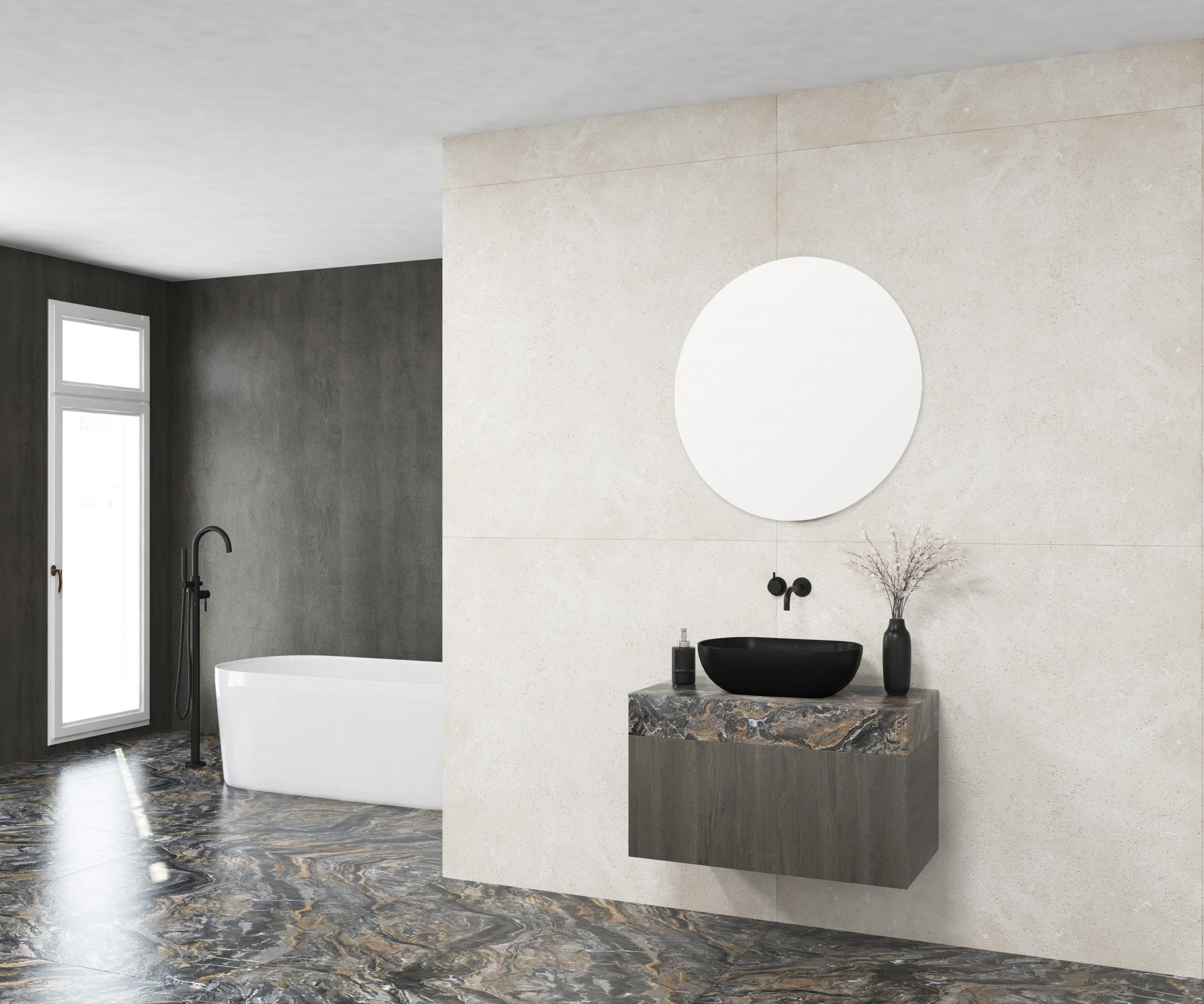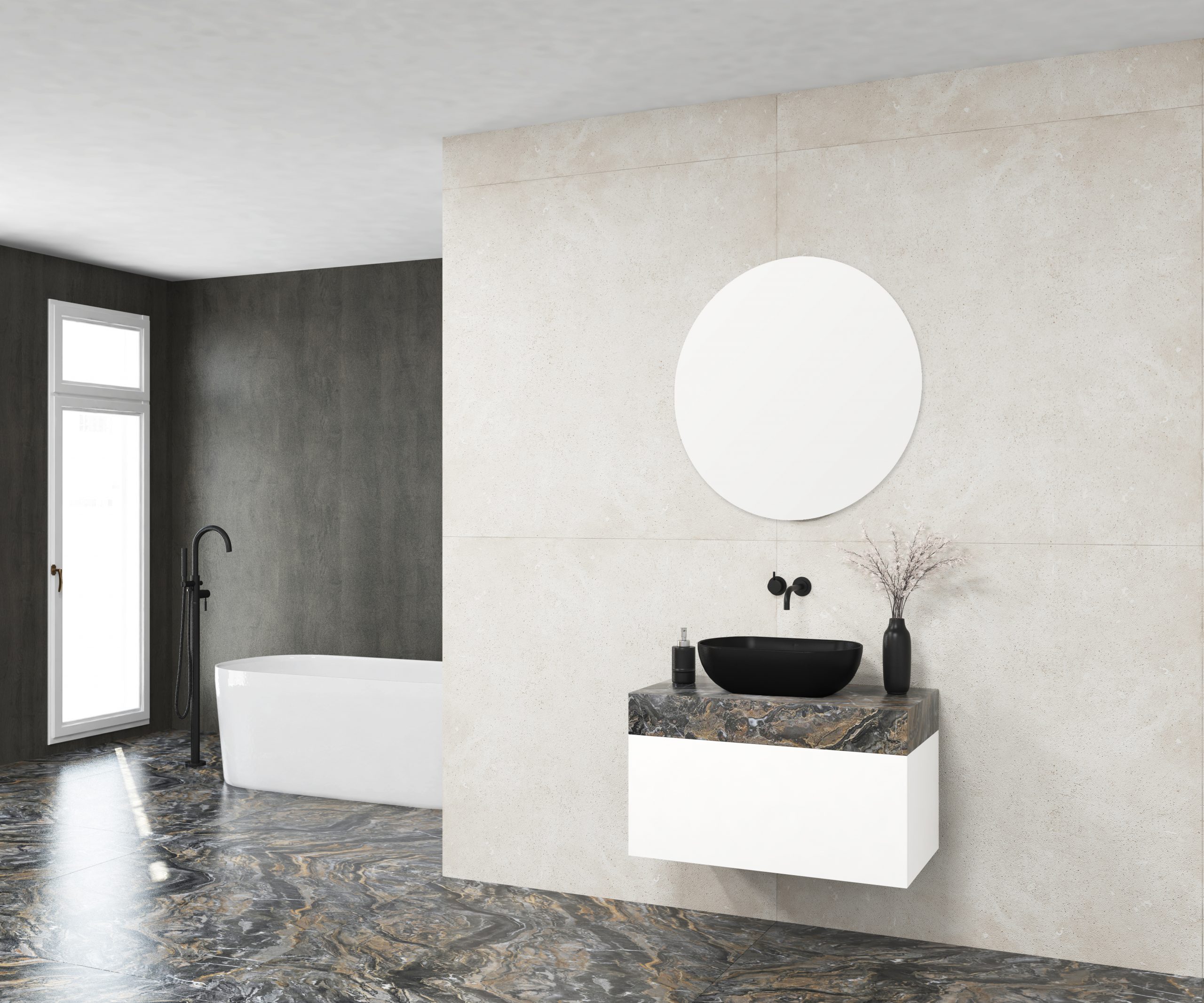 Pack composé d’un meuble de salle de bain, d’une vasque et d’un miroir circulaire. Meuble suspendu pour vasque fabriqué en panneau de particules de 19 mm avec revêtement mélaminé. Composé de deux tiroirs métalliques avec fermeture amortie, capacité de charge de 25 kg, accessibilité totale et espace arrière disponible. Plan de travail sur meuble en matériau Xtone de Porcelanosa, compact minéral fritté issu de la sélection des matières premières les plus pures, permettant d’obtenir une surface aux performances élevées. Comprend une vasque à poser en céramique. Comprend un miroir au design circulaire. Le meuble est livré monté, prêt à être fixé au mur. Un kit de fixation du meuble est inclus. Robinet et siphon non inclus. Fabriqué en Espagne.
