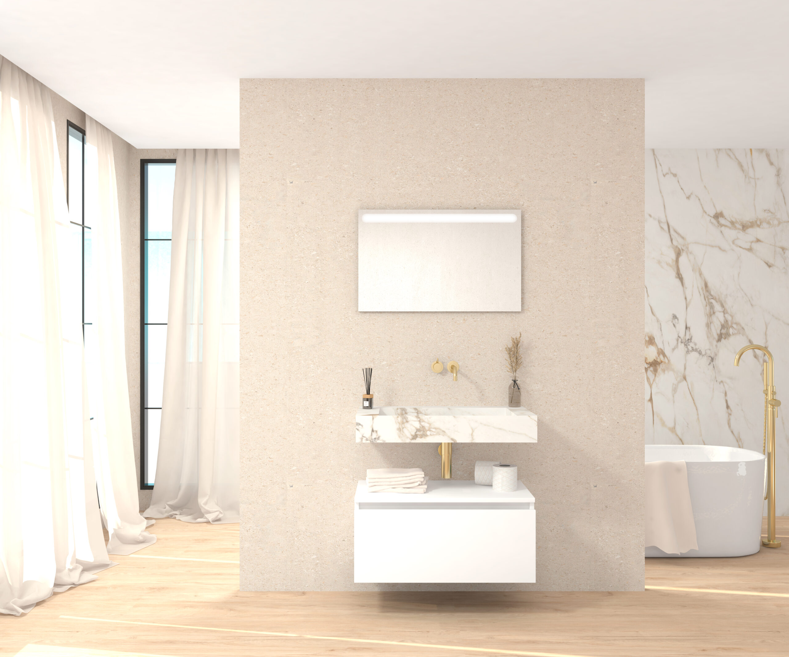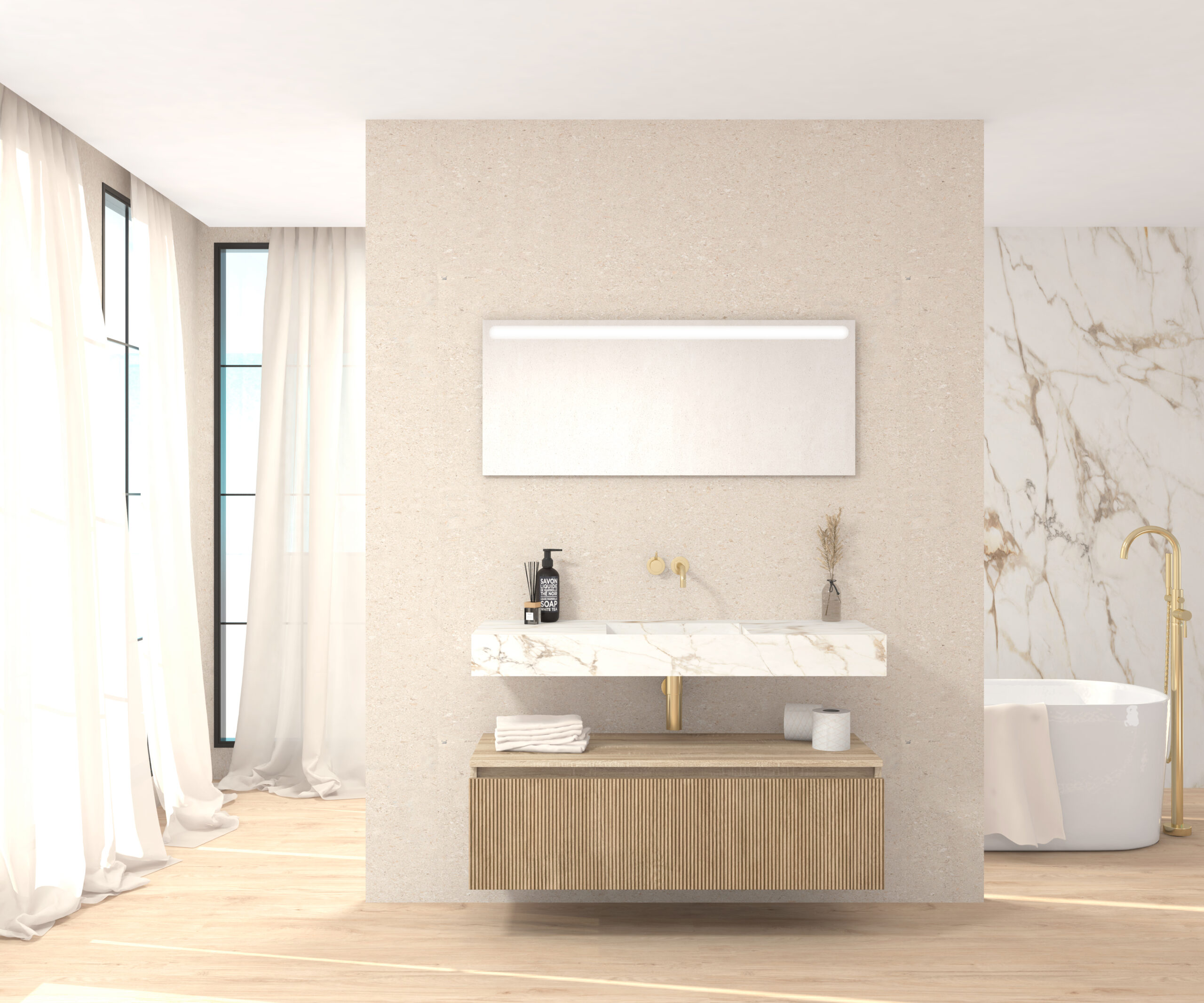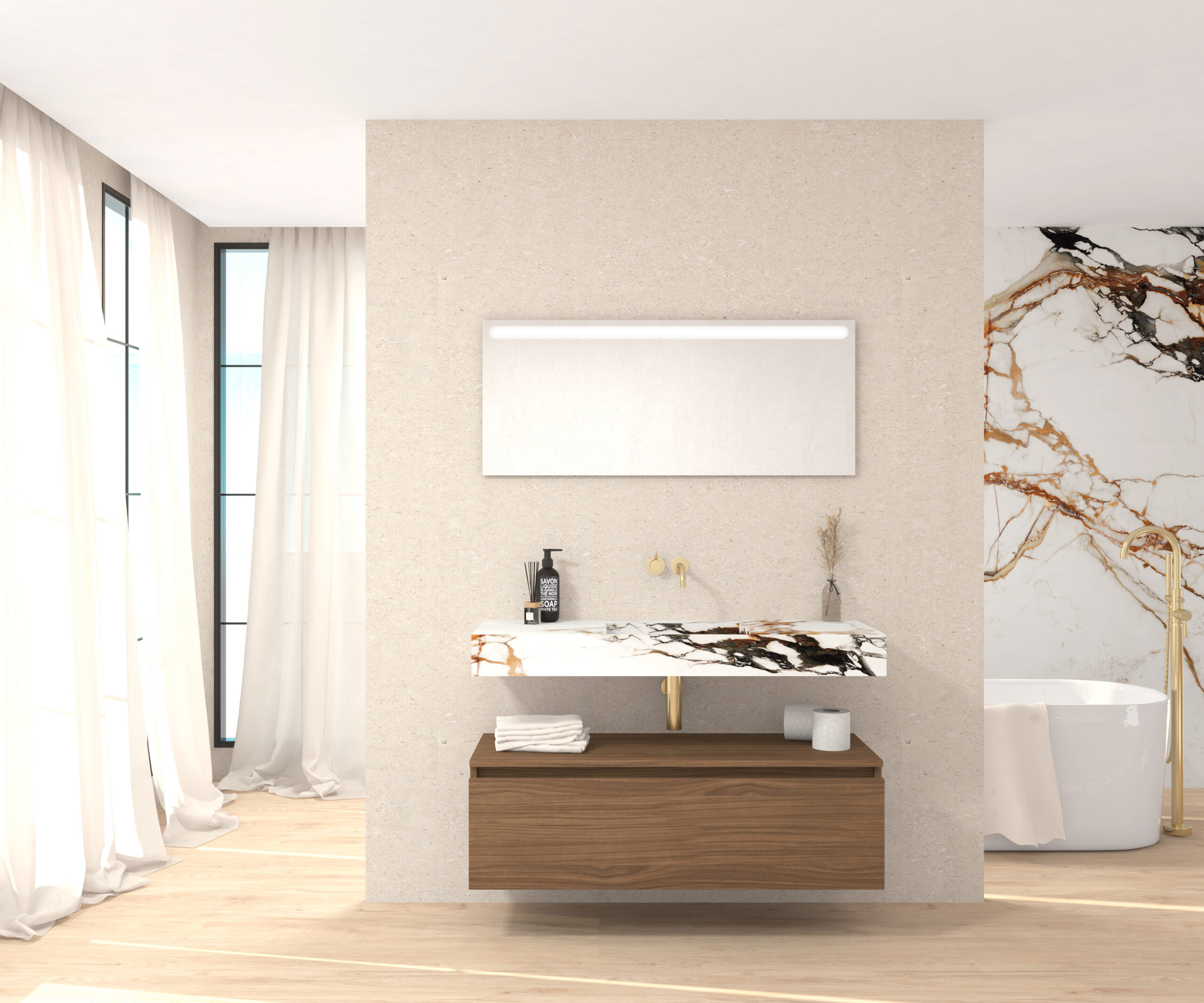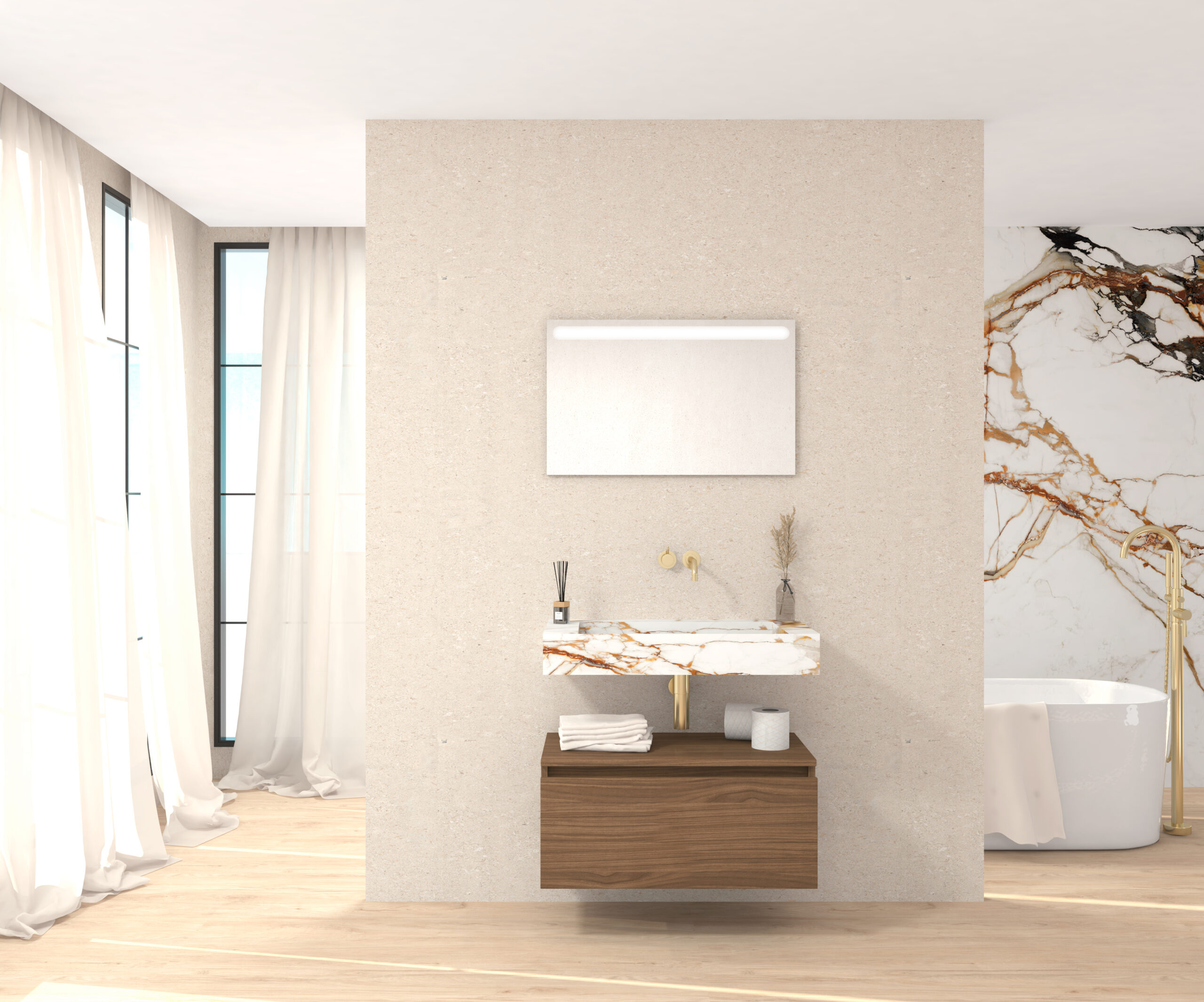 Pack de baño compuesto lavabo suspendido de material Xtone de Porcelanosa, mueble y espejo con iluminación LED. Lavabo suspendido fabricado en material Xtone de Porcelanosa, compacto mineral sinterizado a partir de la selección de materias primas de mayor pureza con las que se obtiene una superficie de elevadas prestaciones. Mueble suspendido de un cajón fabricado en tablero de partículas acabado madera laminado de 19 mm con microrrelieve, con cajón de extracción total y cierre suave. Incluye espejo con iluminación LED, IP65, 10,8 W, 1170lm y temperatura de la luz 6000K. El mueble se sirve montado, preparado para colgar a la pared. Se incluye kit para la colocación del mueble. Grifo y sifón no incluidos. Fabricado en España.