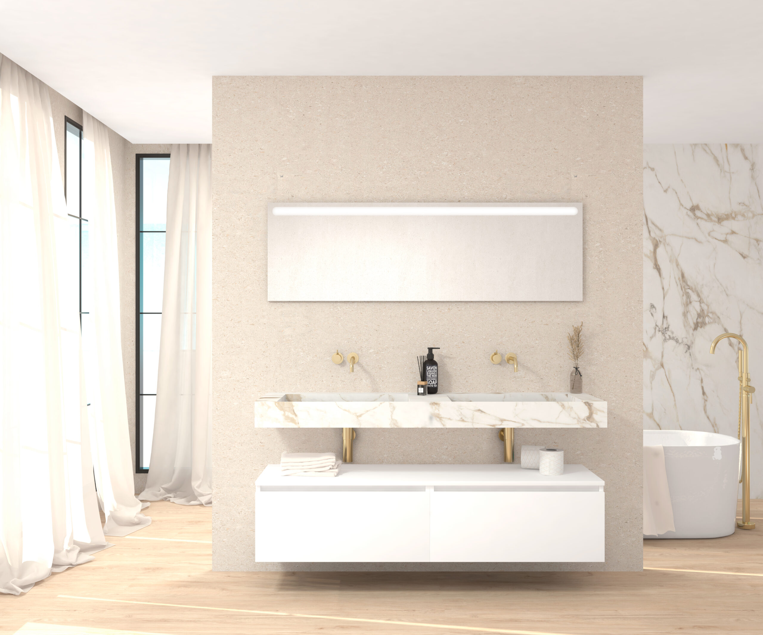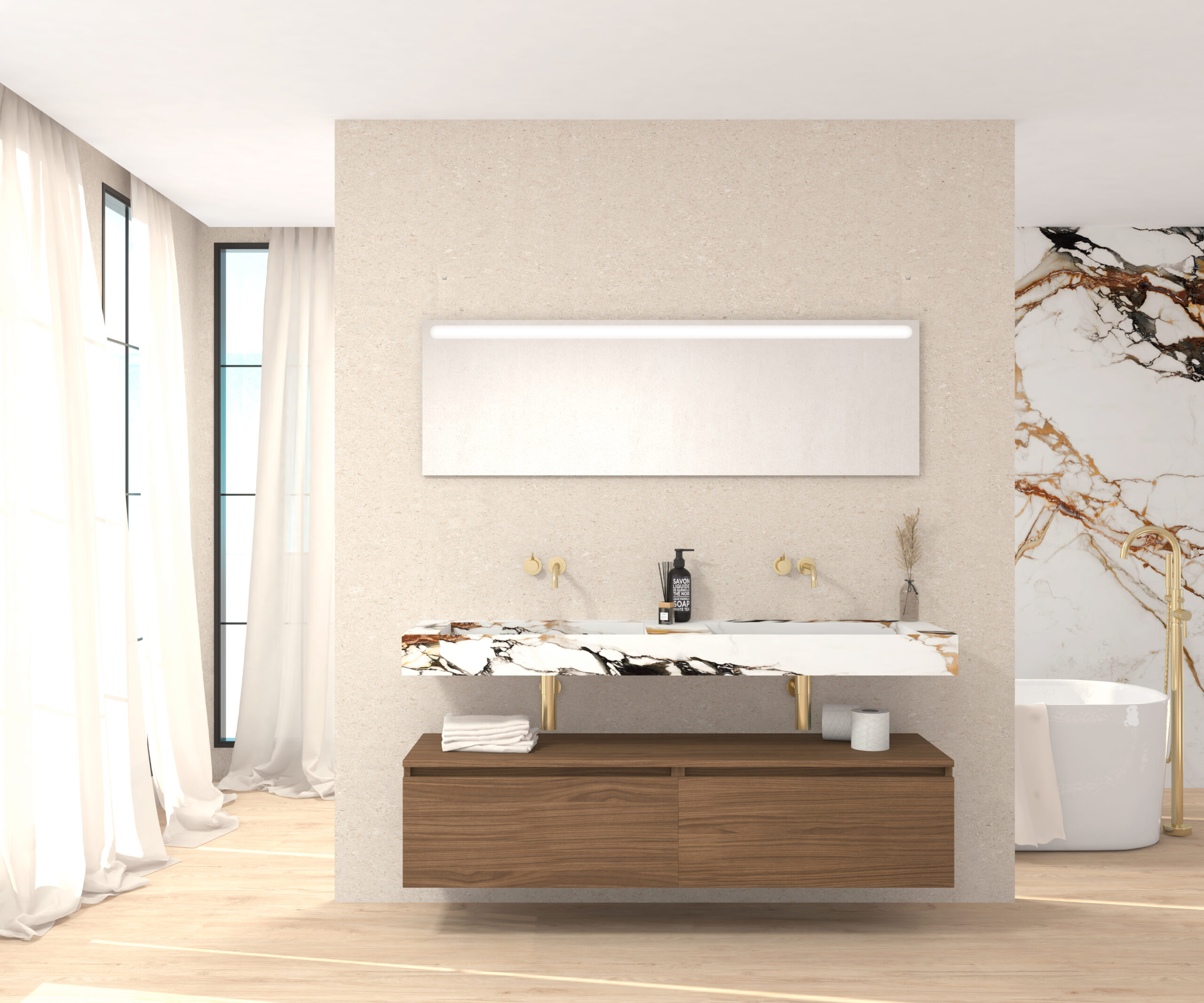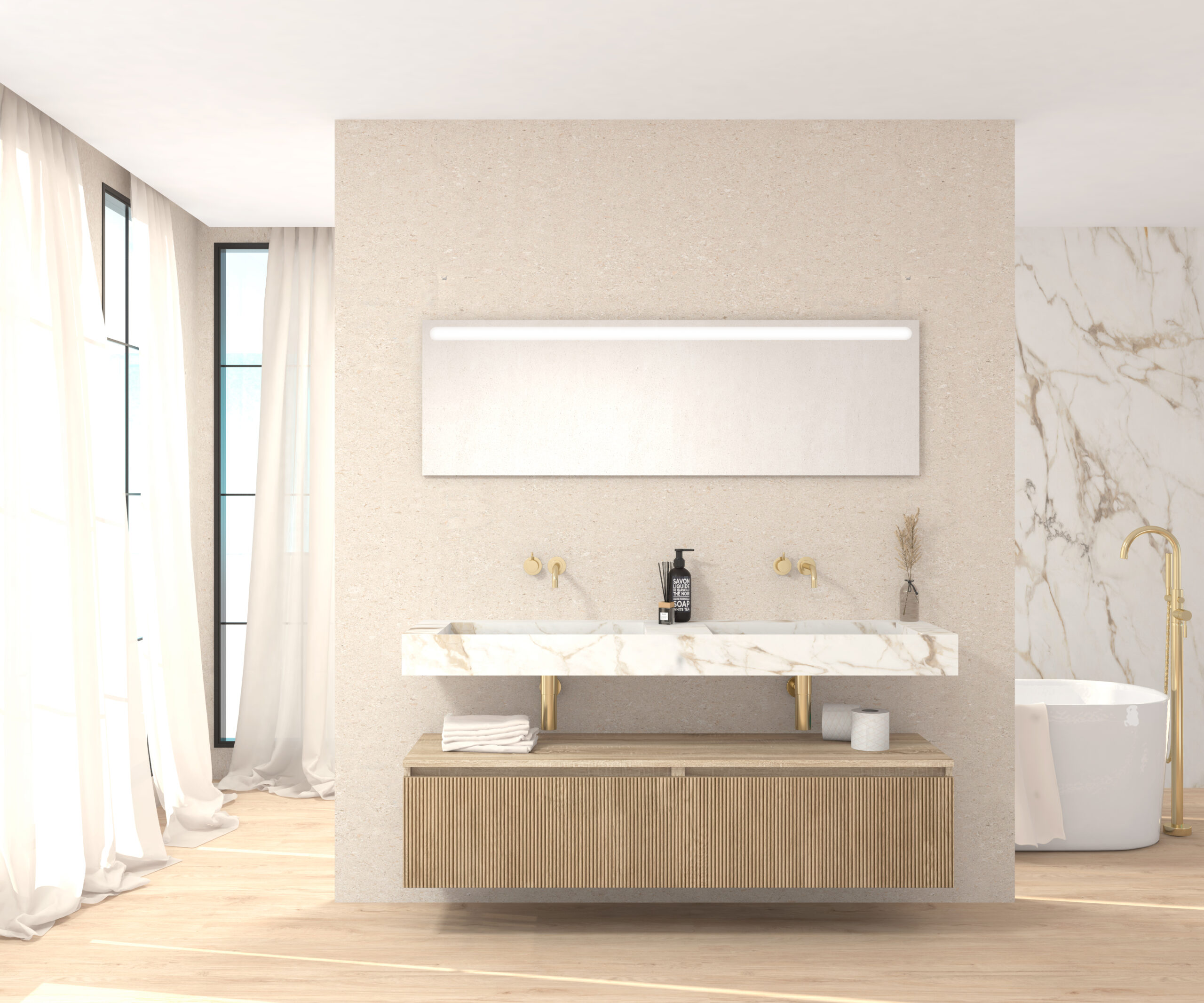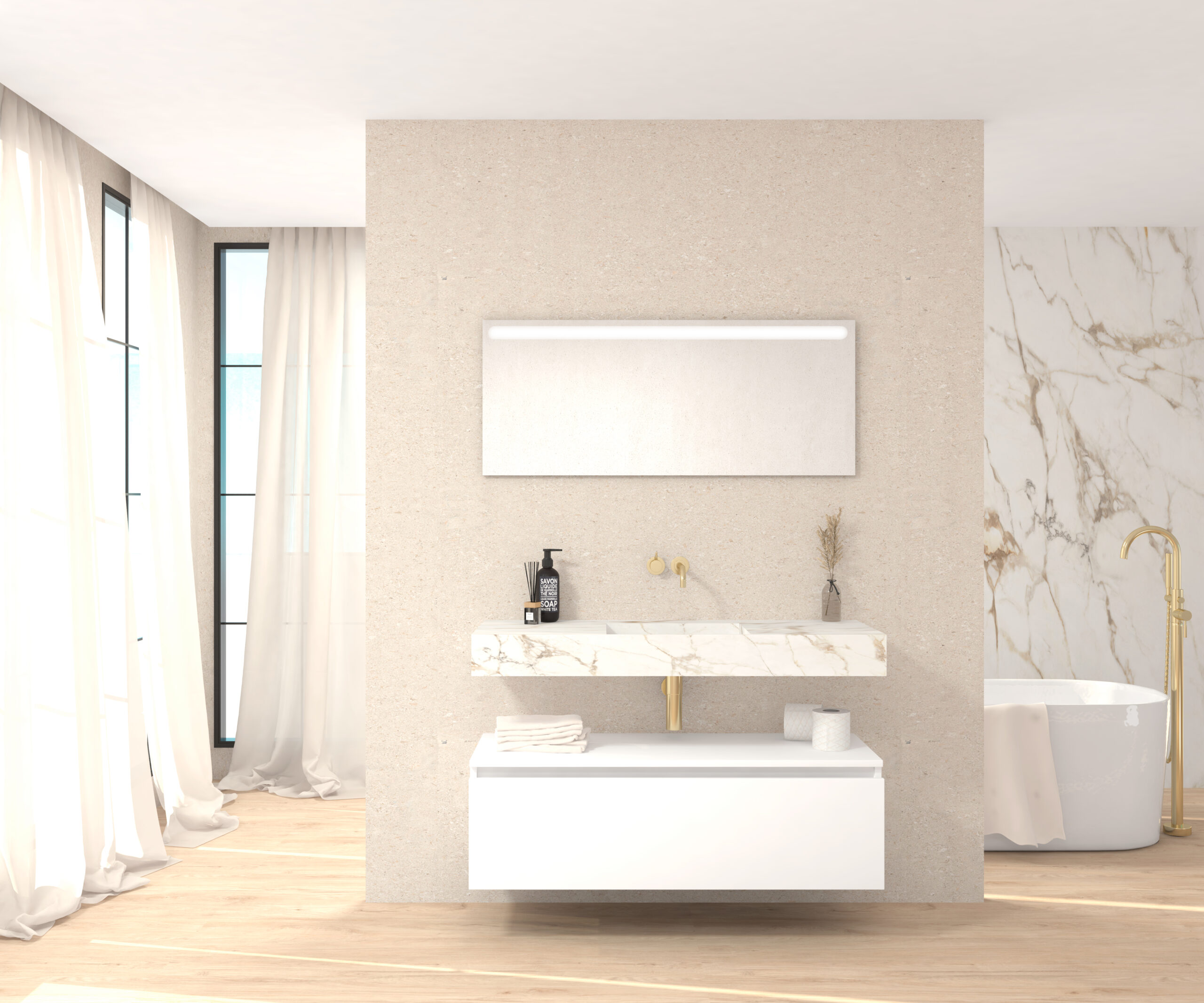 Pack de baño compuesto lavabo suspendido de material Xtone de Porcelanosa, mueble y espejo con iluminación LED. Lavabo suspendido fabricado en material Xtone de Porcelanosa, compacto mineral sinterizado a partir de la selección de materias primas de mayor pureza con las que se obtiene una superficie de elevadas prestaciones. Mueble suspendido de un cajón fabricado en tablero de partículas acabado madera laminado de 19 mm con microrrelieve, con cajón de extracción total y cierre suave. Incluye espejo con iluminación LED, IP65, 10,8 W, 1170lm y temperatura de la luz 6000K. El mueble se sirve montado, preparado para colgar a la pared. Se incluye kit para la colocación del mueble. Grifo y sifón no incluidos. Fabricado en España.